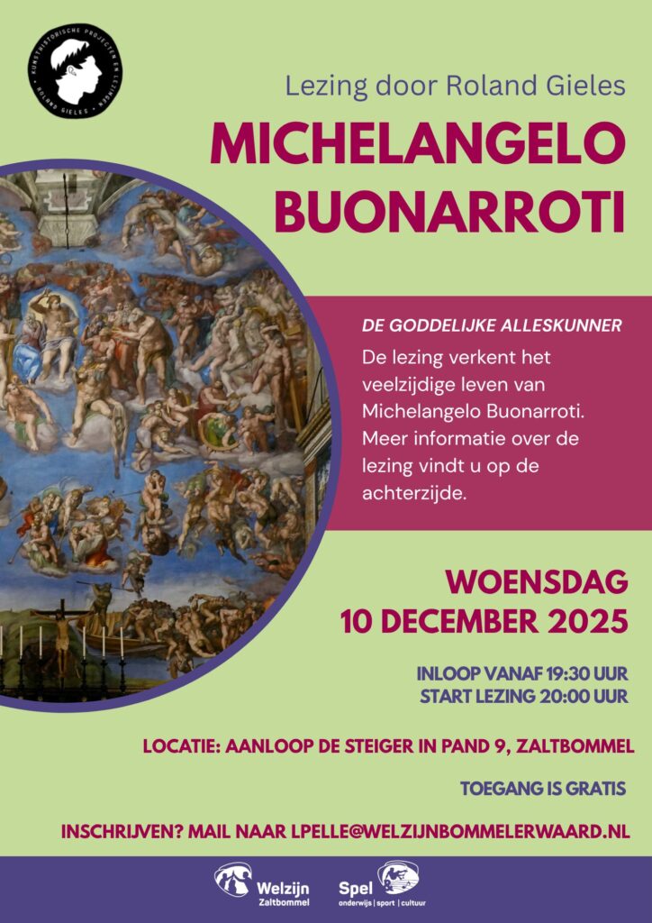Op woensdag 10 december organiseren we een lezig over Michelangelo Buonarroti bij Aanloop de Steiger. Tijdens de lezing kom je meer te weten over het werk en het leven van Michelangelo. Gaandeweg wordt ontrafeld hoe Michelangelo niet alleen de andere kunstenaars, maar ook zichzelf steeds wist te overtreffen.