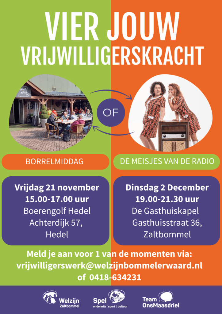Aan het einde van het jaar bedanken we de vrijwilligers van de Bommelerwaard weer voor hun geweldige inzet. Dit doen wij op 2 verschillende momenten. Kom op 21 november gezellig naar de borrelmiddag bij de Boerengolf in Hedel. Ontmoet andere vrijwilligers terwijl je geniet van een hapje en een drankje. Is muziek meer jouw ding? Op 2 december komen De Meisjes van de Radio naar de Gasthuiskapel voor een sfeervolle avond vol muziek. Geniet van liedjes van de jaren 50 t/m 80, bekende jingles, radio spelletjes en een heleboel vrolijke interactie!
